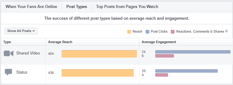 For instance, if your Facebook account stats show that posts with videos on your page are the most active, like here,
