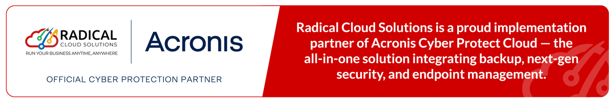 As an official Acronis implementation partner, Radical Cloud Solutions focuses on delivering technical solutions that directly address the RTO challenge. We utilise Acronis Cyber Protect Cloud, a unified platform that combines backup, advanced cybersecurity, and rapid disaster recovery capabilities.